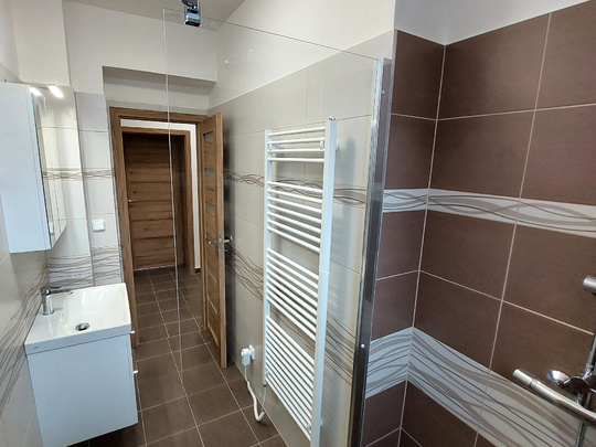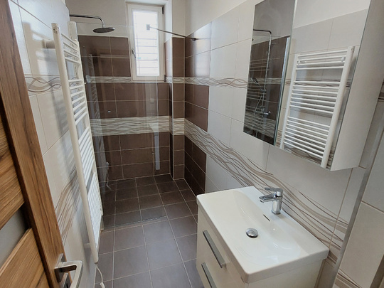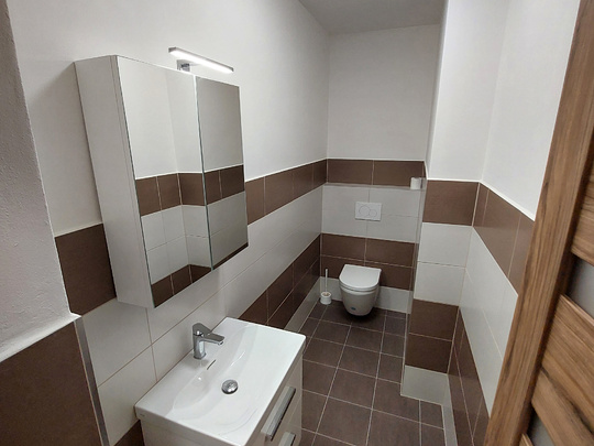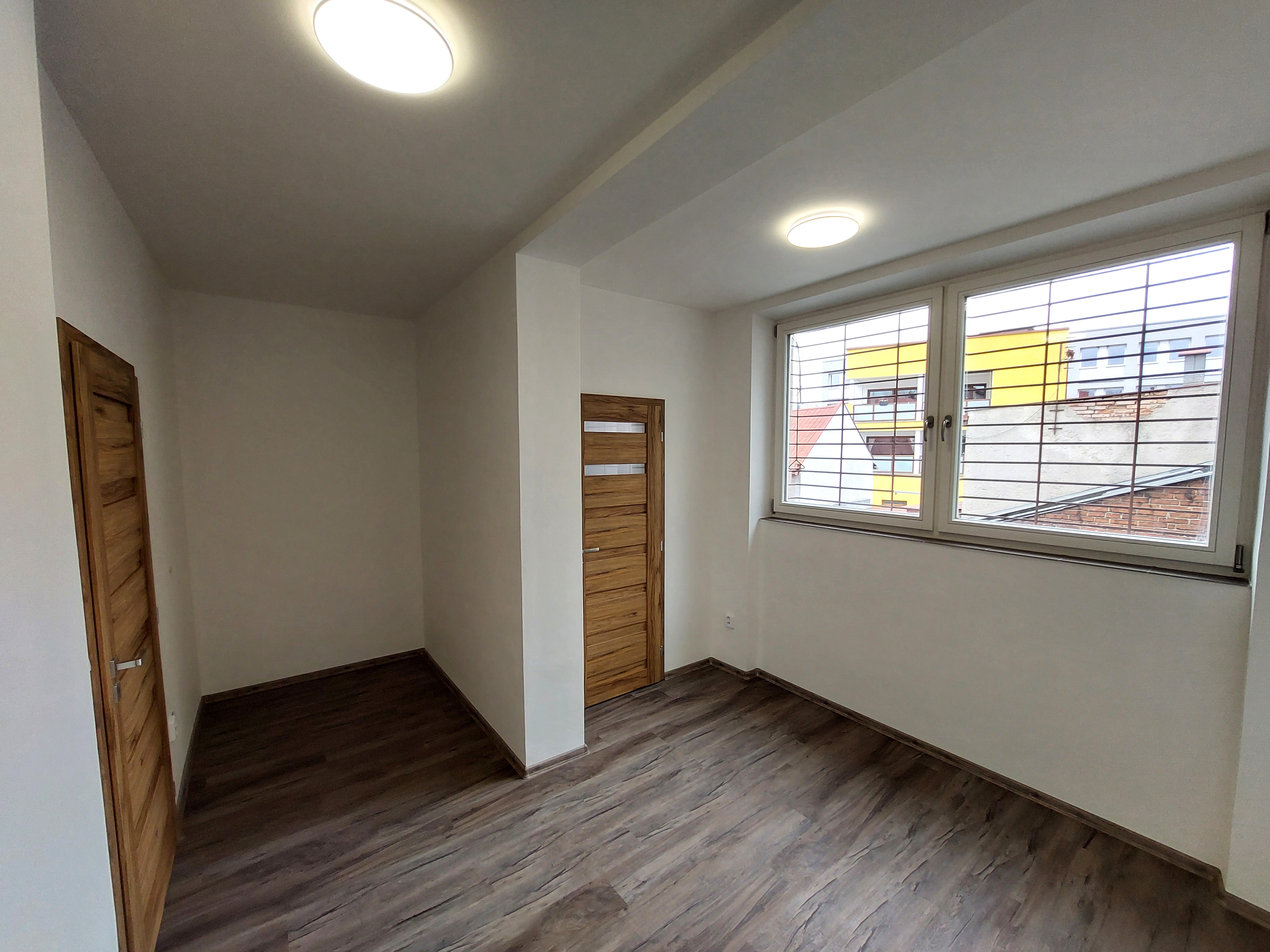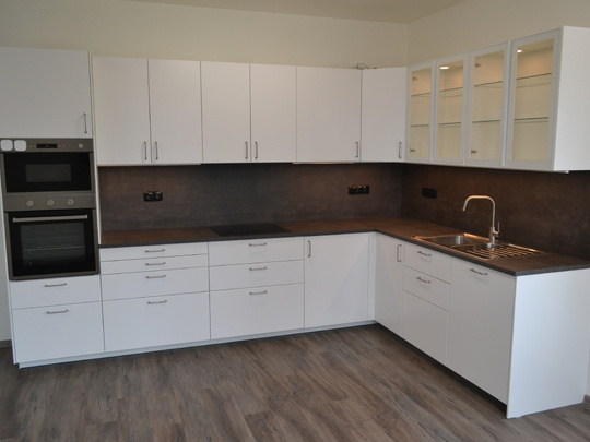 Moderní byt typu 3+kk (93 m²) po kompletní rekonstrukci ve 2. podlaží cihlové budovy, k pronájmu přímo od majitelů. Základem bytu je velký obývací pokoj (36 m²) s kuchyňským koutem vybaveným elektrickou troubou, vestavnou mikrovlnnou troubou, indukčním sporákem, myčkou na nádobí a digestoří. Dále je k dispozici ložnice (18,5 m²), pokoj (13 m²), koupelna se sprchou, umývárna s toaletou, sušárna/komora (4 m²) a chodba.