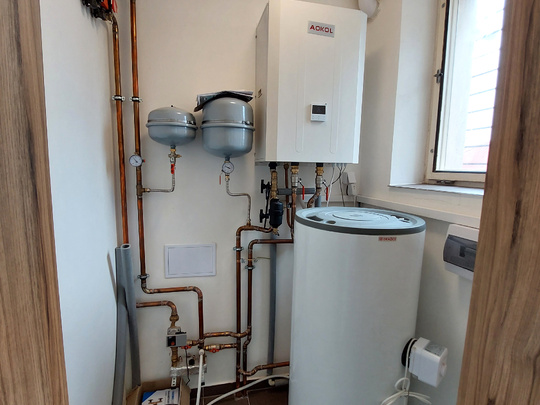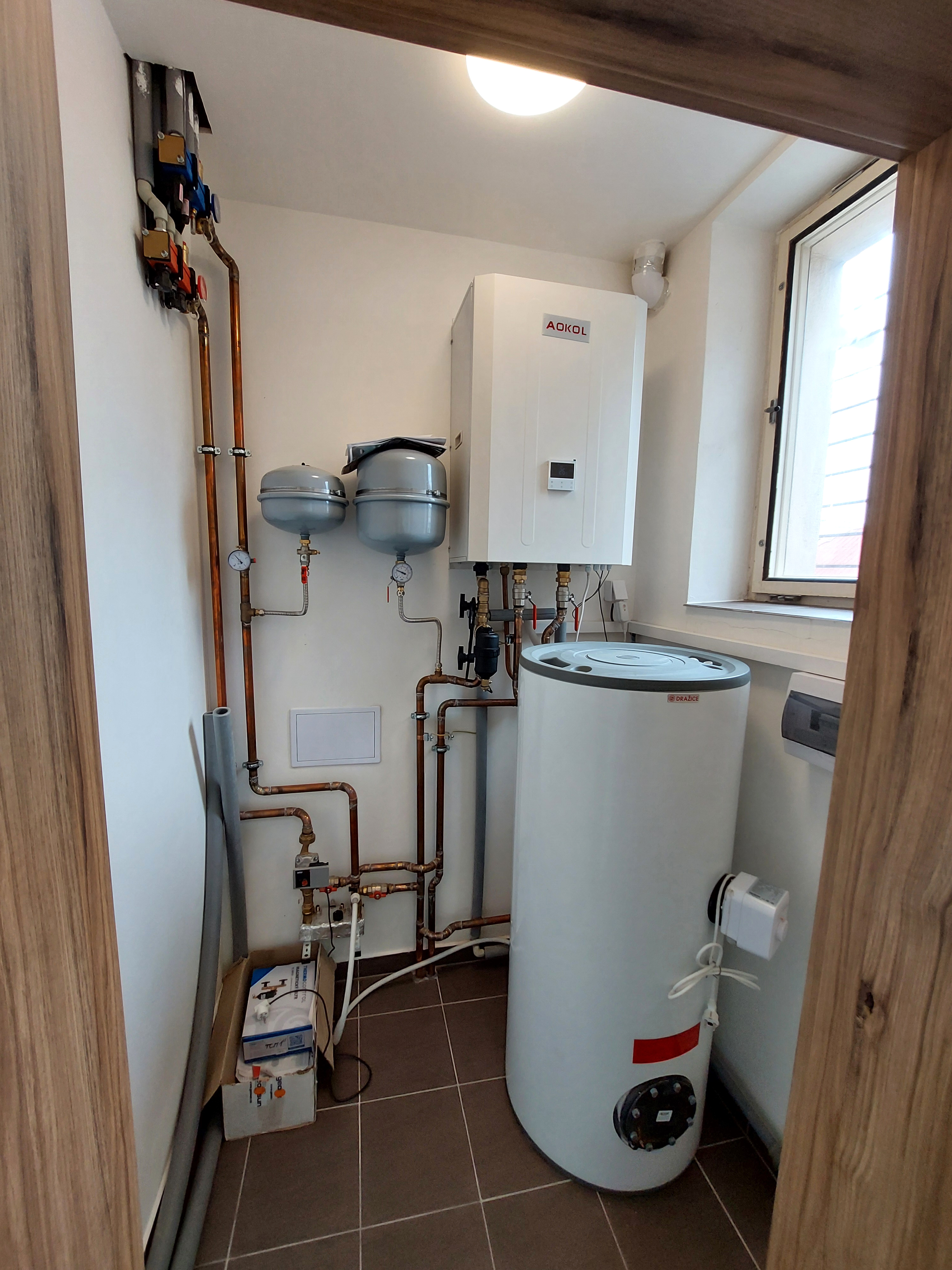 Součástí bytu je také technická místnost s tepelným čerpadlem typu vzduch-voda, poskytujícím nízkonákladové podlahové a stropní vytápění, klimatizaci (pouštěním ochlazované vody do kapilár) i ohřev vody. Díky tepelnému čerpadlu jsou náklady na energie výrazně levnější oproti tradičním řešením.
